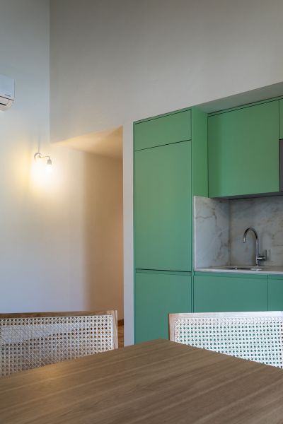 Bedroom with double bed, mezzanine with single bed, kitchen, living room and bathroom.