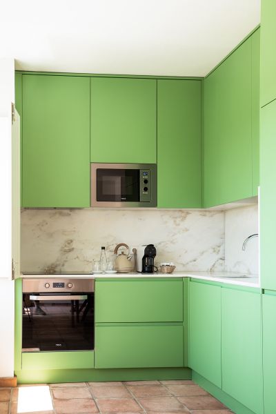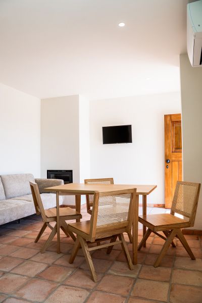 Bedroom with double bed, kitchen, living room with sofa bed, bathroom and view.