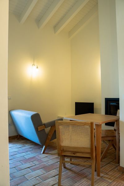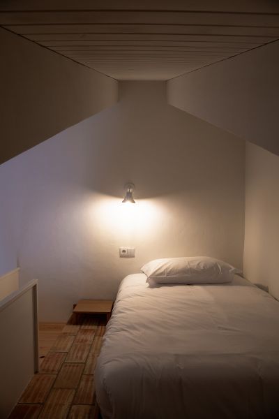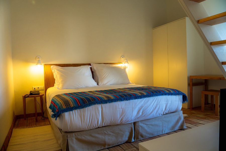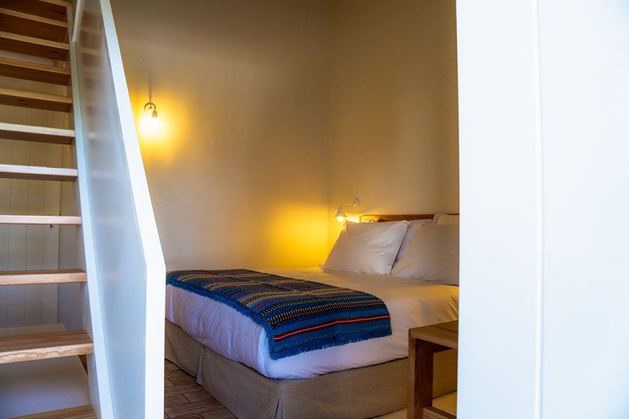 Quarto com Cama de casal, mezzanine com cama single, cozinha, sala e wc.